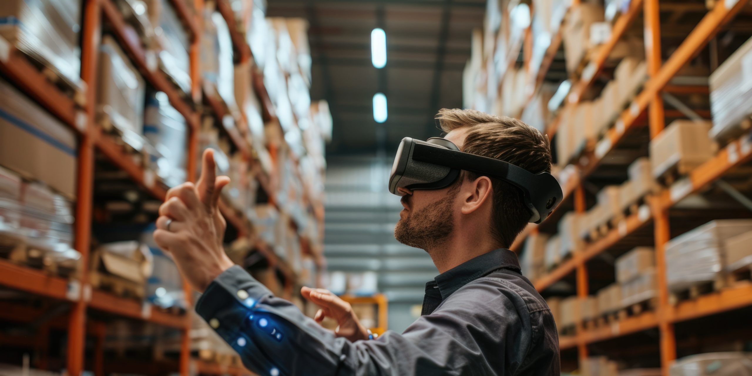 A man is using a VR headset in a warehouse for inventory management and training tasks AIG62