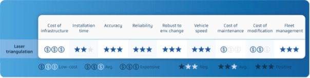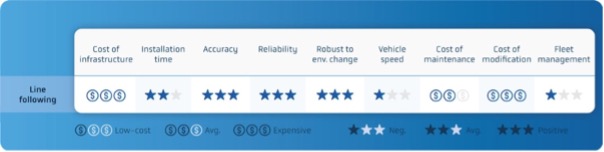 Although accurate and reliable, line following has a high initial infrastructure investment cost and takes a long time to install. It is robust to changes in the environment, but cost of maintenance of the lines and cost of any modification required are high. If more than one vehicle is required within an area, fleet management is also complicated.