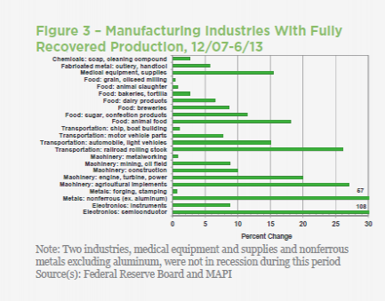 Manufacturing industrial production has increased faster than inflation-adjusted gross domestic product (increasing 18 percent while GDP expanded 9 percent), but manufacturing is still in the recovery phase of its cycle. Manufacturing production declined 20 percent in the recession, and production needs to increase another 5 percent from its Q2 2013 reading in order to return to  Q4 2007 levels. MAPI forecasts that the sector will complete its recovery in Q4 2014.