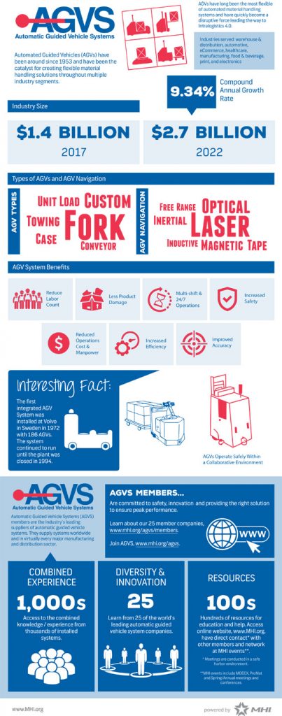 MHI’s Automatic Guided Vehicle Systems (AGVS) Industry Group just released this helpful infographic on AGVS technology. The infographic is a quick and easy way to learn more key facts about automatic guided vehicle systems, including industry size, benefits, and types of AGV solutions. Download the infographic to share with your colleagues, print out or post on social media!